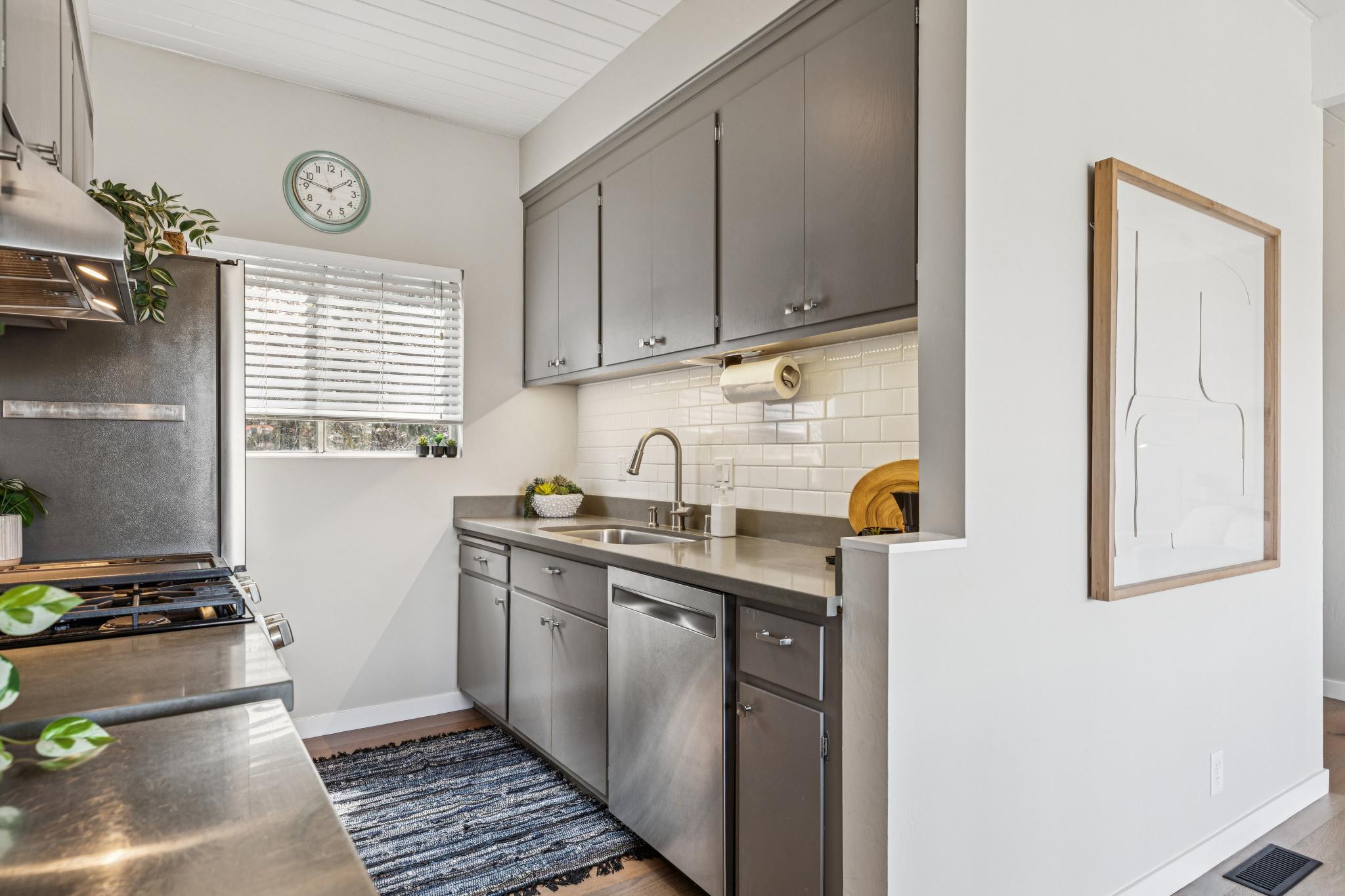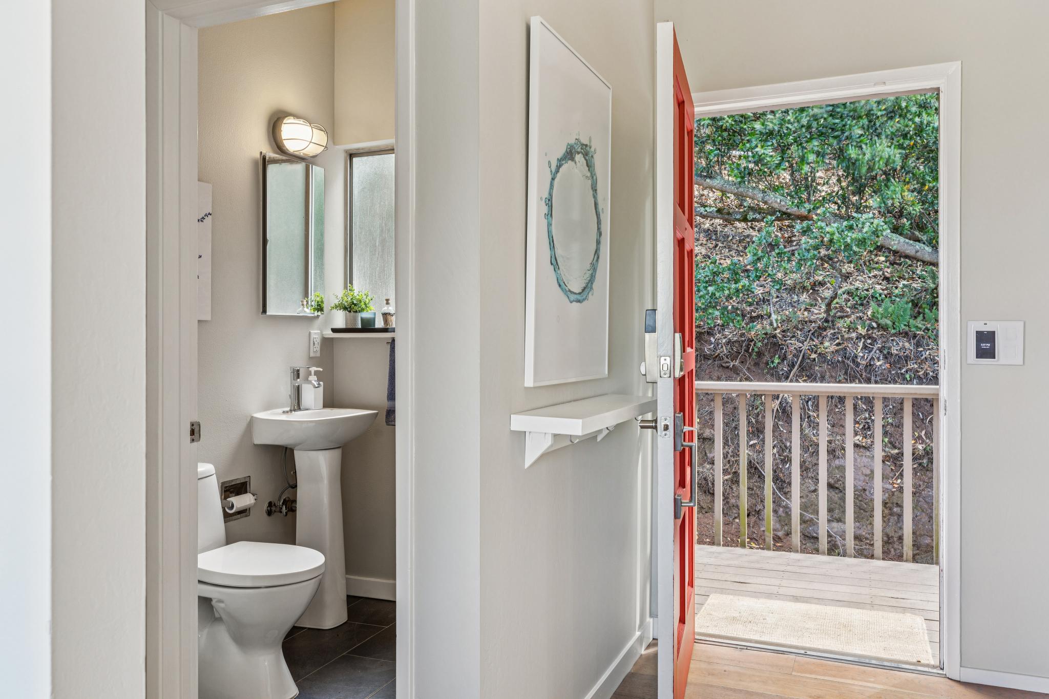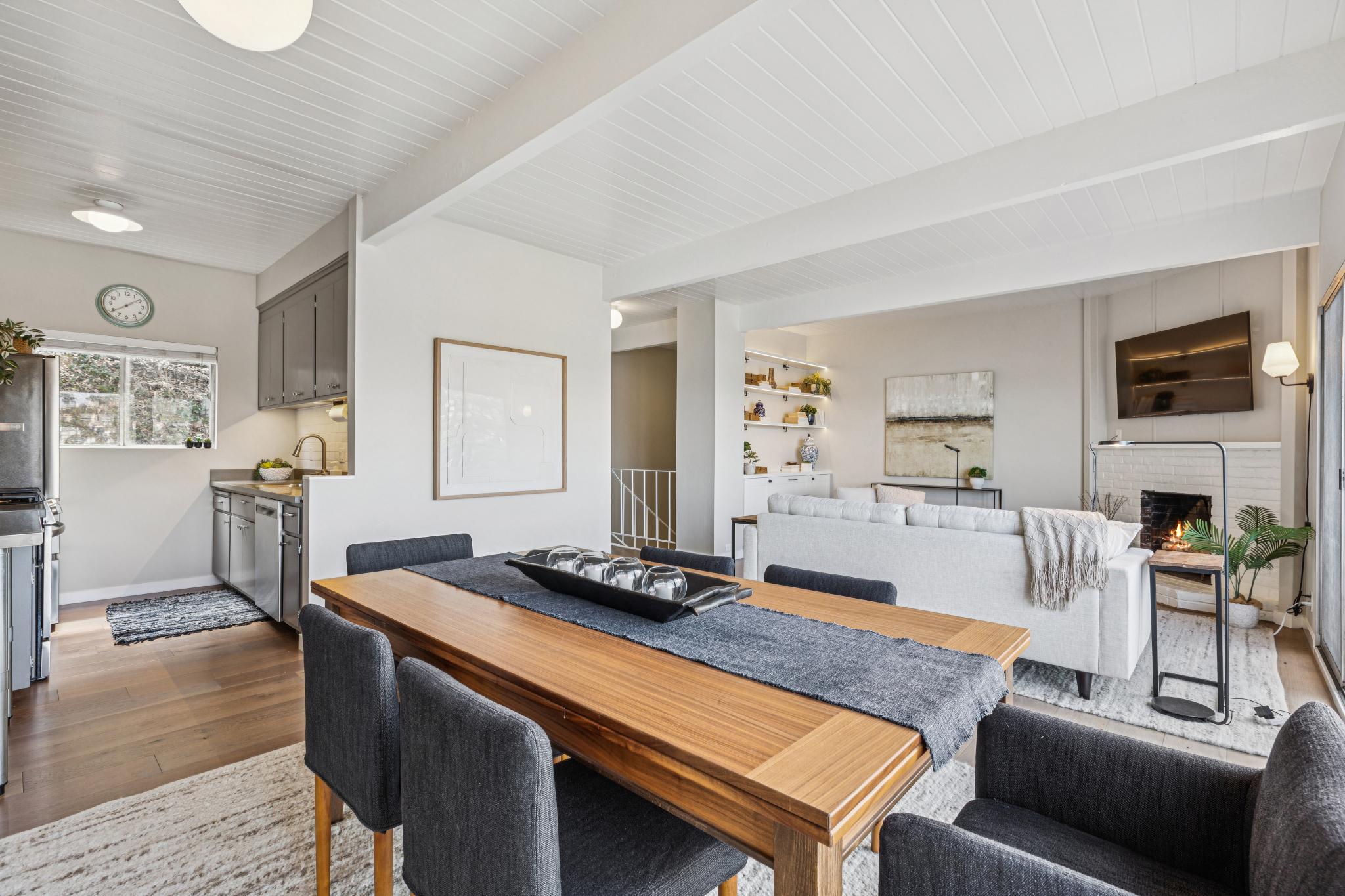 2 bedrooms, 1 full bath, one half bath, good storage, a wood burning fireplace, wonderful updates, and a 2 car carport make for an ideal home for living and entertaining. Hardwood floors upstairs with the half bath / powder room, a good sized view deck, a warm & inviting fireplace, a nicely updated kitchen, custom shelving with elegant lighting and well thought out tech each enhance the top floor living experience. The open beamed ceilings and thoughtful updates both preserve and transform the mid-century origin into an inviting modern era lifestyle.