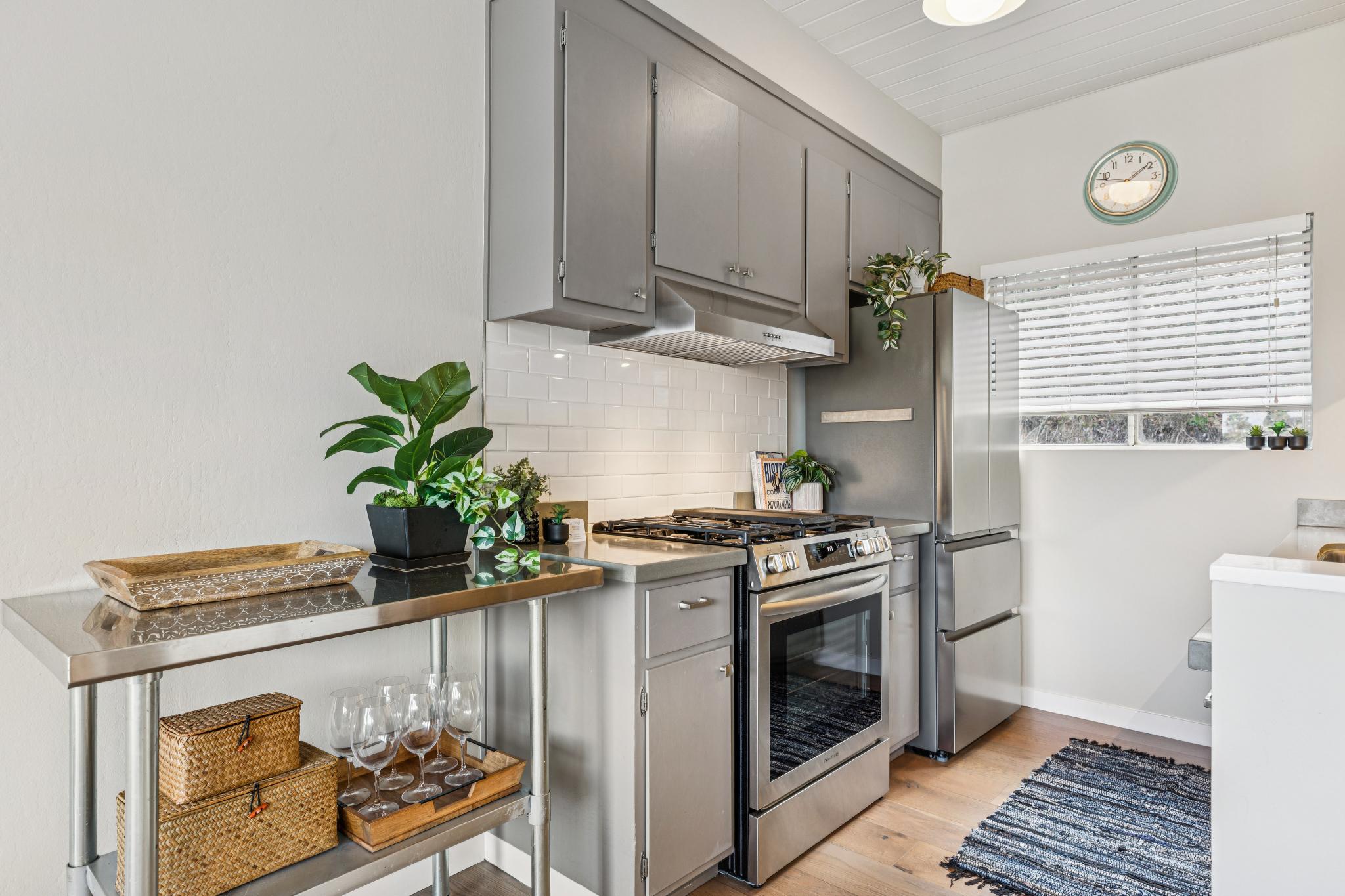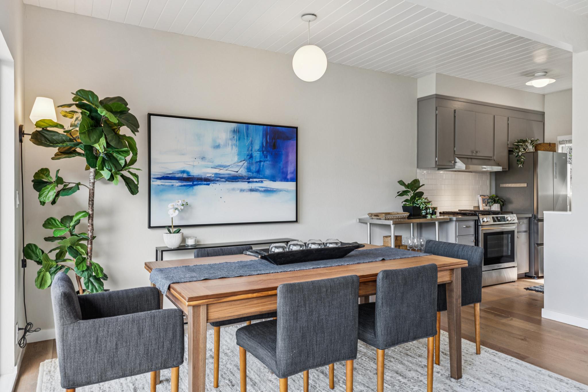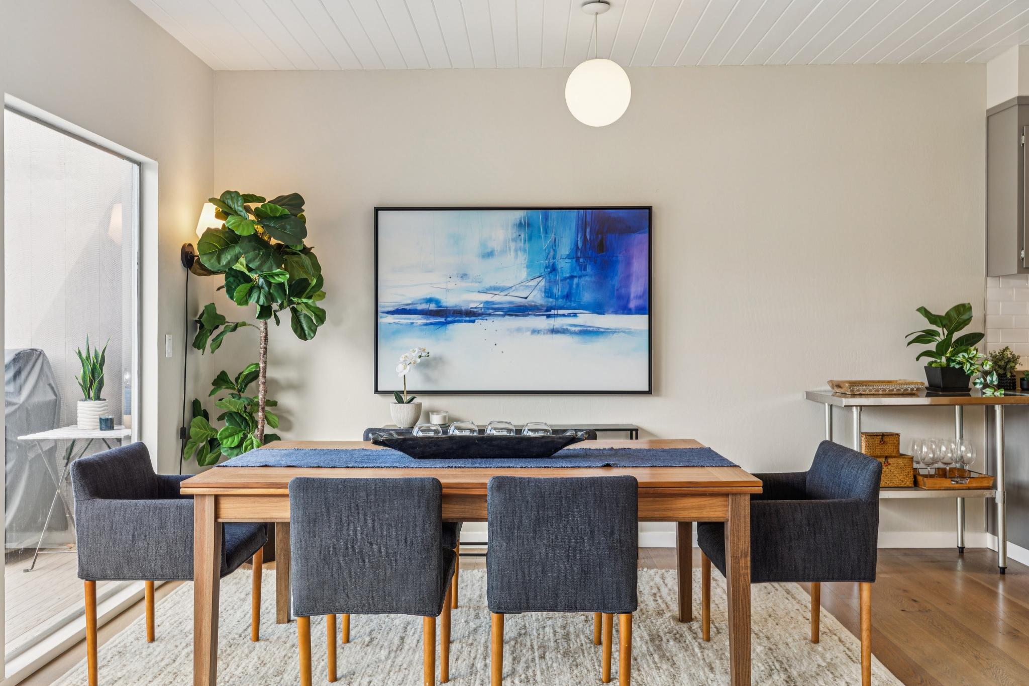 2 bedrooms, 1 full bath, one half bath, good storage, a wood burning fireplace, wonderful updates, and a 2 car carport make for an ideal home for living and entertaining. Hardwood floors upstairs with the half bath / powder room, a good sized view deck, a warm & inviting fireplace, a nicely updated kitchen, custom shelving with elegant lighting and well thought out tech each enhance the top floor living experience. The open beamed ceilings and thoughtful updates both preserve and transform the mid-century origin into an inviting modern era lifestyle.
