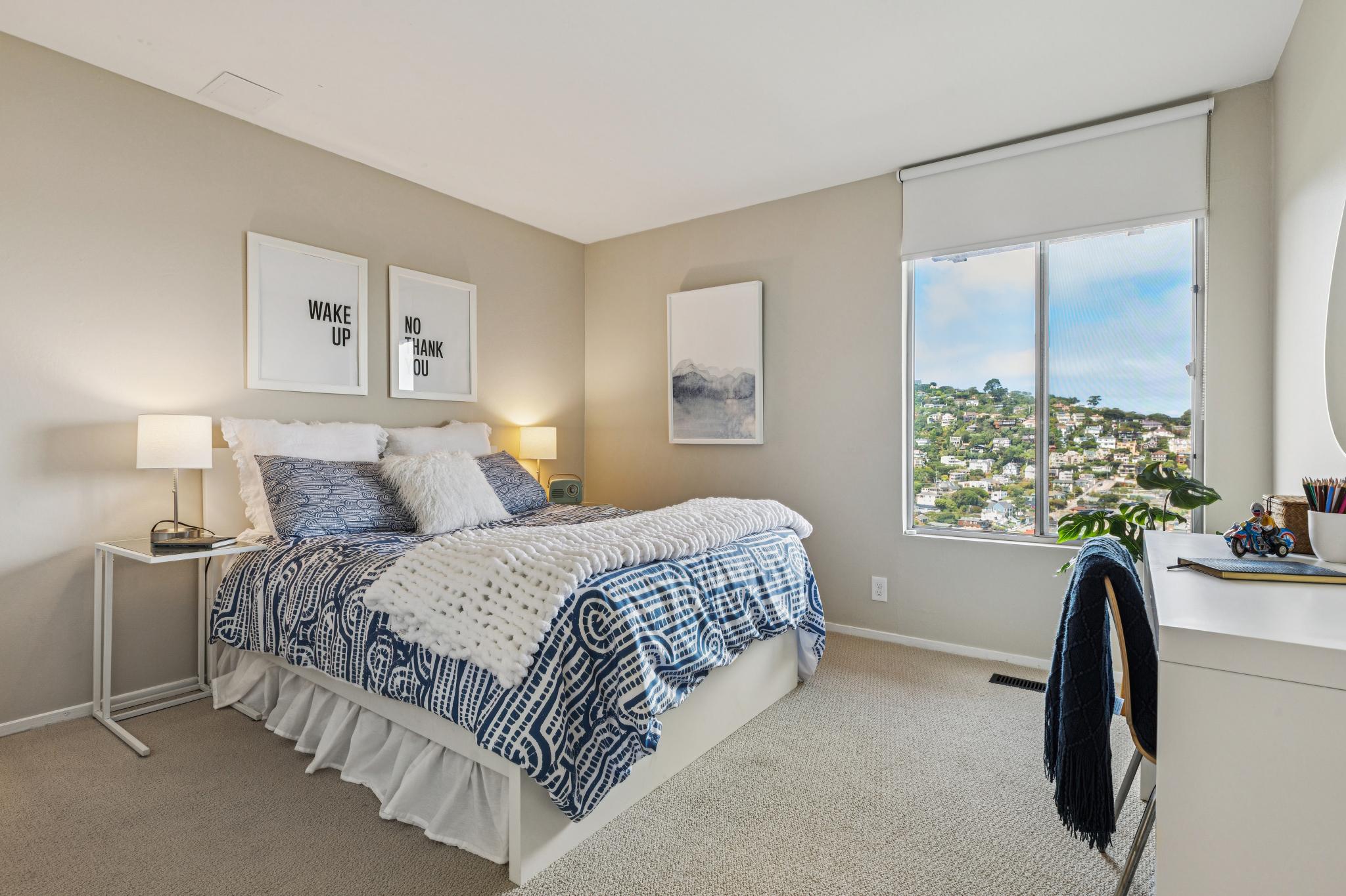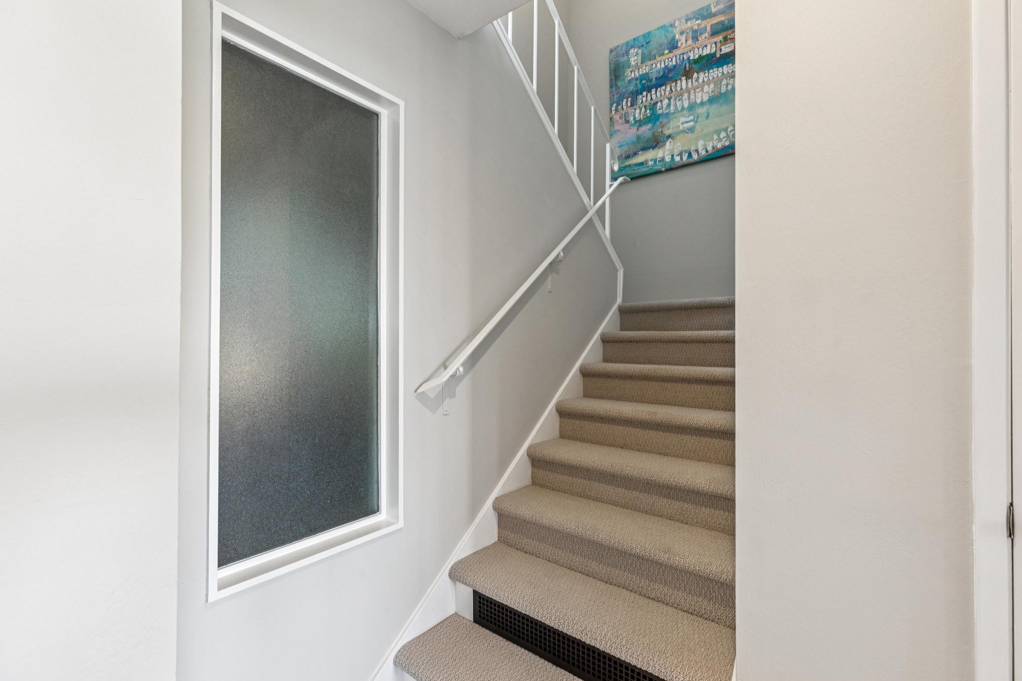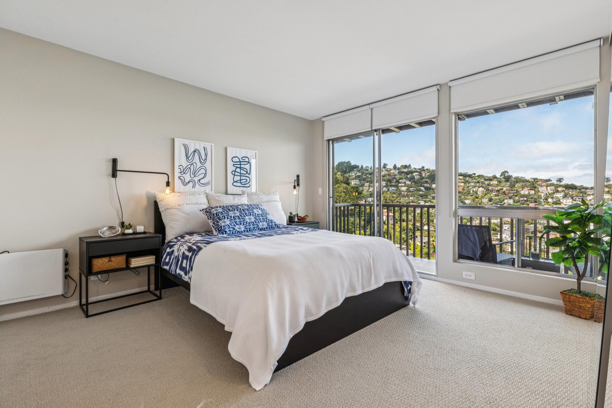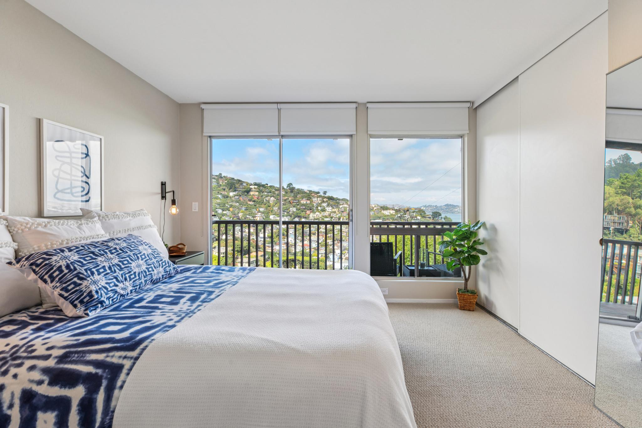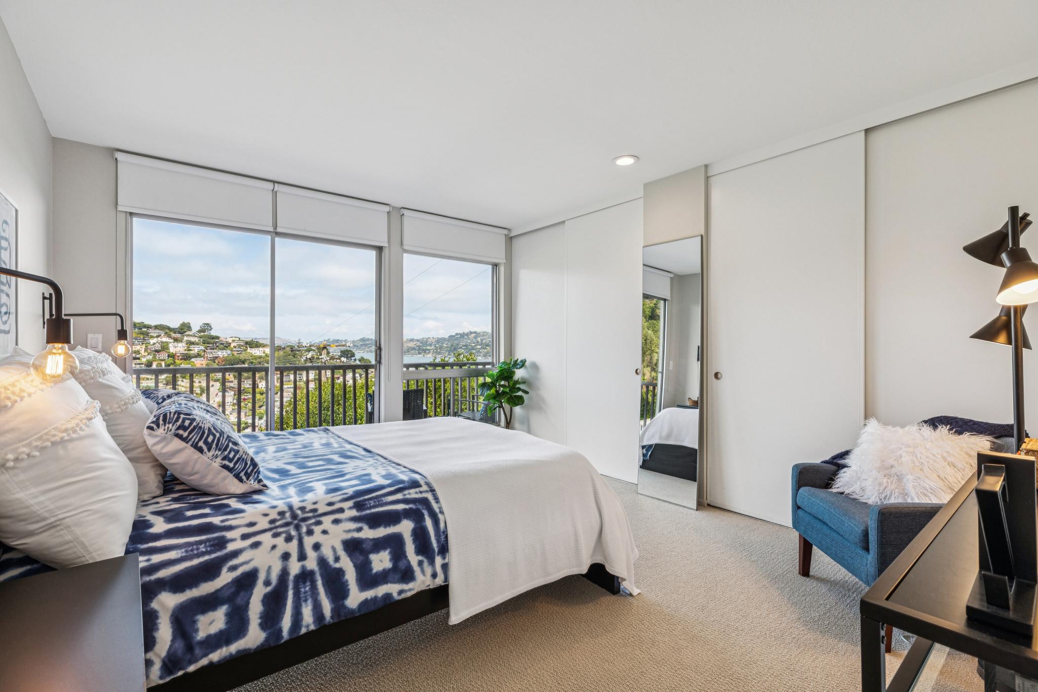 The staircase and lower floor is newly carpeted and the nearly the entire interior is newly painted for a fresh start. The main bath is inviting and elegant complete with a bath tub, tiled floors, and updated vanity. Hallway closets provide ample space for storage while the larger bedroom with deck off the glass slider has an ideal view of the Bay wall to wall closets. The guest bedroom, also with amazing views, can also serve as an office easily with room for a desk. A well designed closet in the guest bedroom contains the in-home electronics hub as well as more great storage space.