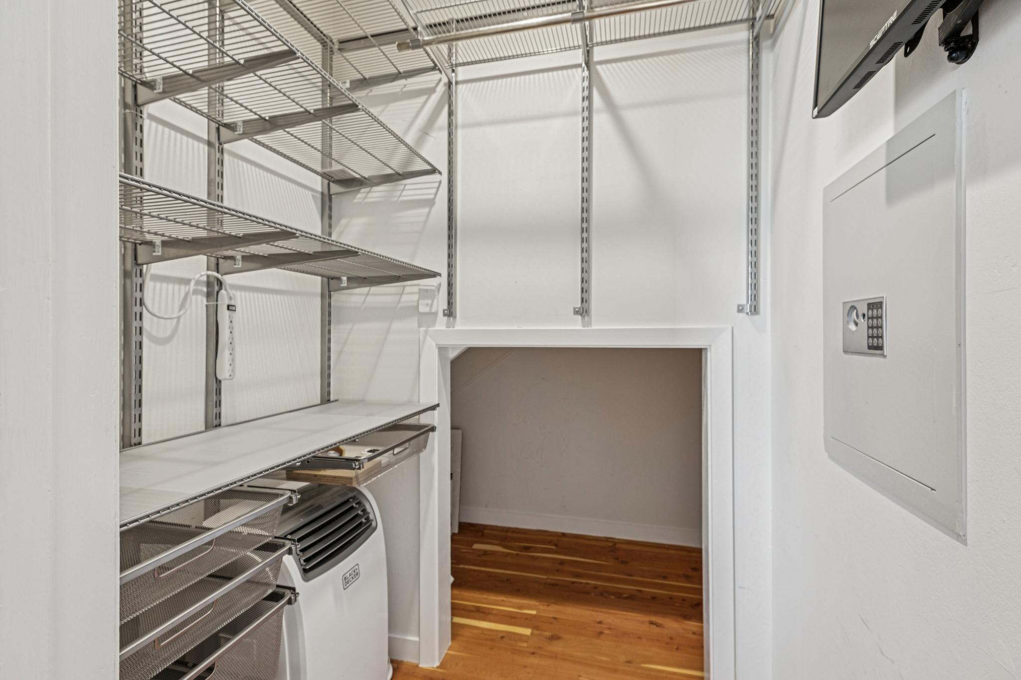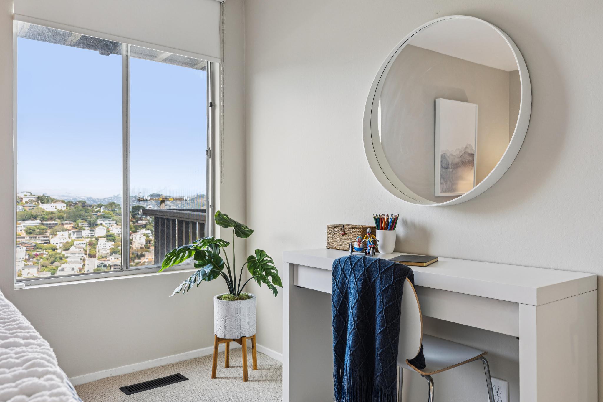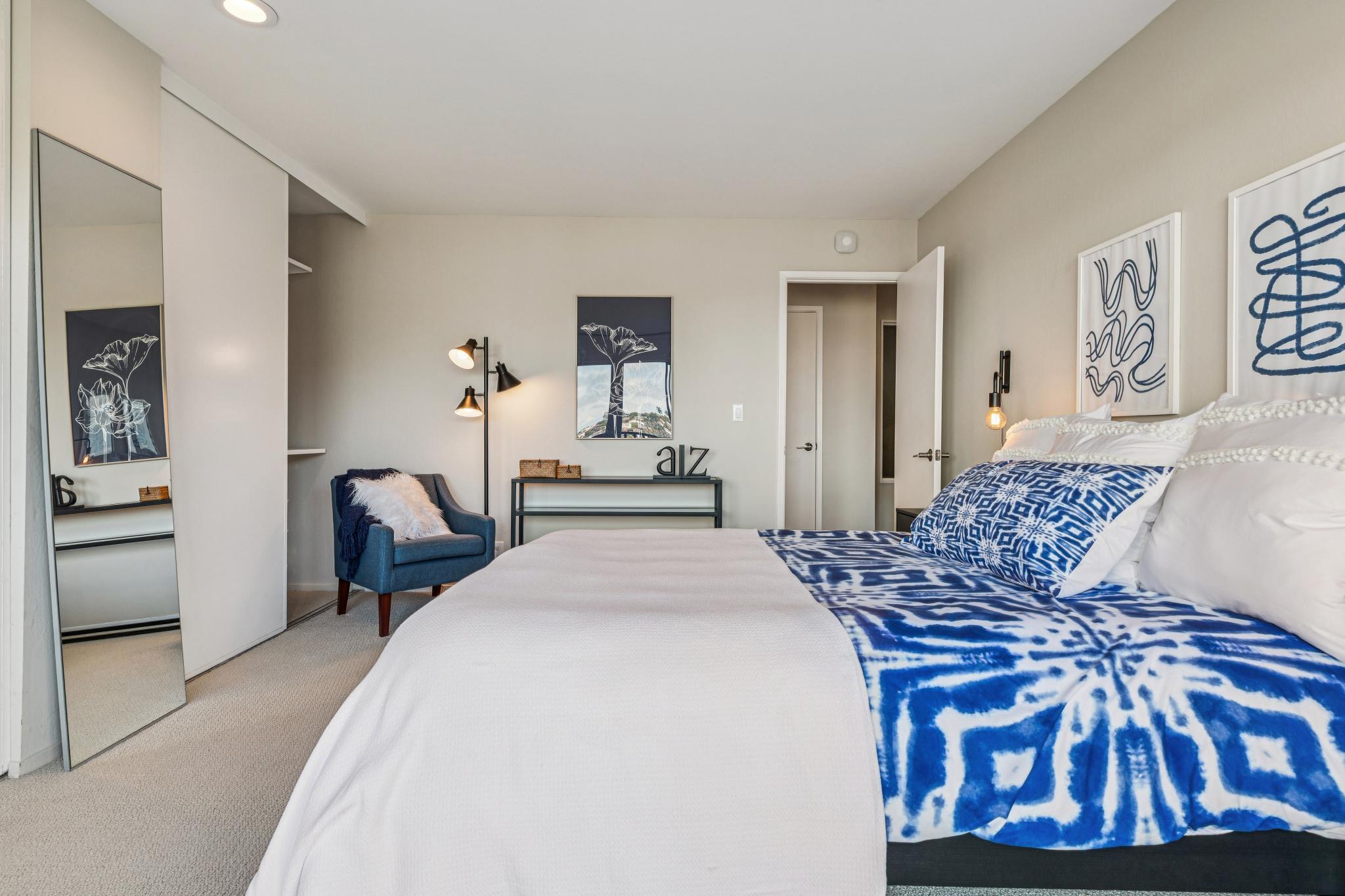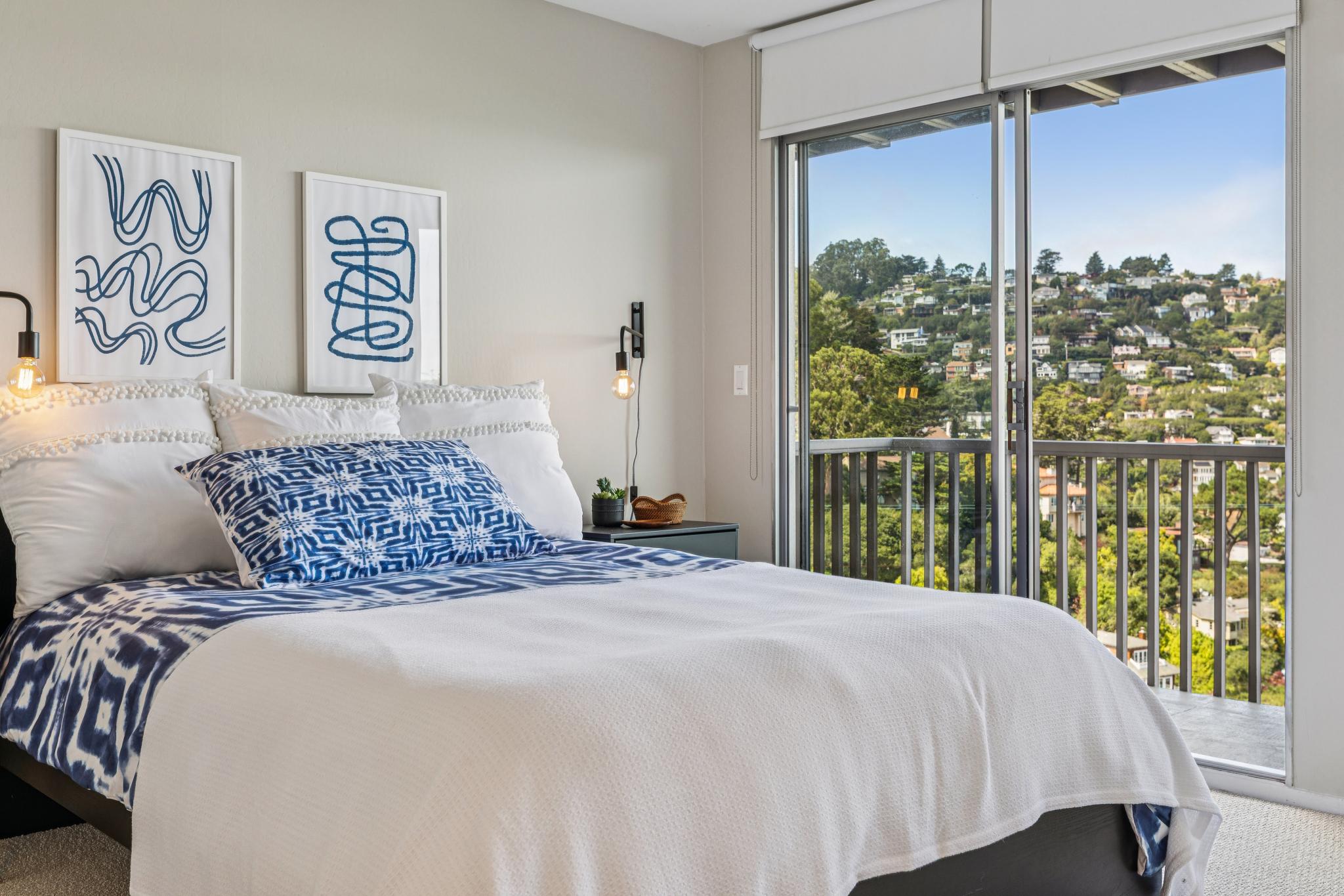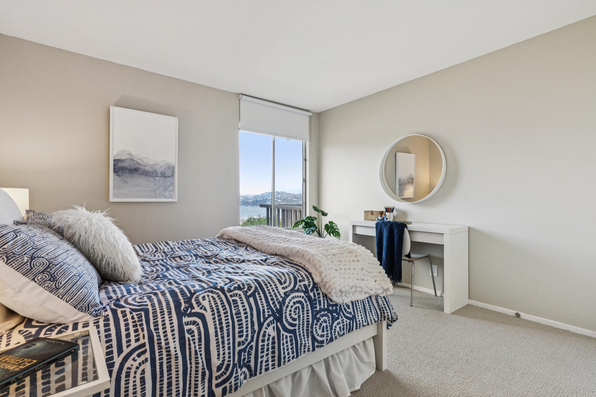 The staircase and lower floor is newly carpeted and the nearly the entire interior is newly painted for a fresh start. The main bath is inviting and elegant complete with a bath tub, tiled floors, and updated vanity. Hallway closets provide ample space for storage while the larger bedroom with deck off the glass slider has an ideal view of the Bay wall to wall closets. The guest bedroom, also with amazing views, can also serve as an office easily with room for a desk. A well designed closet in the guest bedroom contains the in-home electronics hub as well as more great storage space.