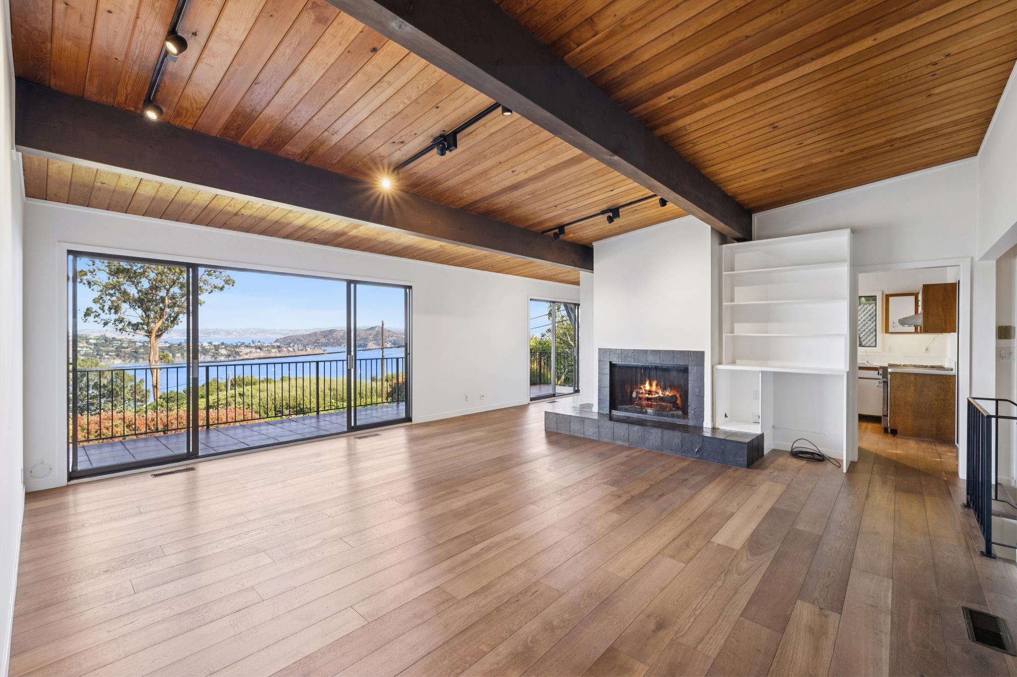 The landing opens to floor-to-ceiling double sliders on both sides of the flexible floor plan encompassing a living room and adjoining dining area, sitting, or yoga studio space. With exposed beams, a gas-insert fireplace, and built-in shelving the space takes full advantage of its prime surroundings. Step through to the front deck to enjoy morning coffee or a sunny afternoon on the grand Spanish-tiled ~60 foot terrace and main deck with a spectacular 180-degree Bay views. To the back are decks and a brick patio that flank the vast, meditative and mature tree-lined yard, idyllic for entertainment and spiritual moments.