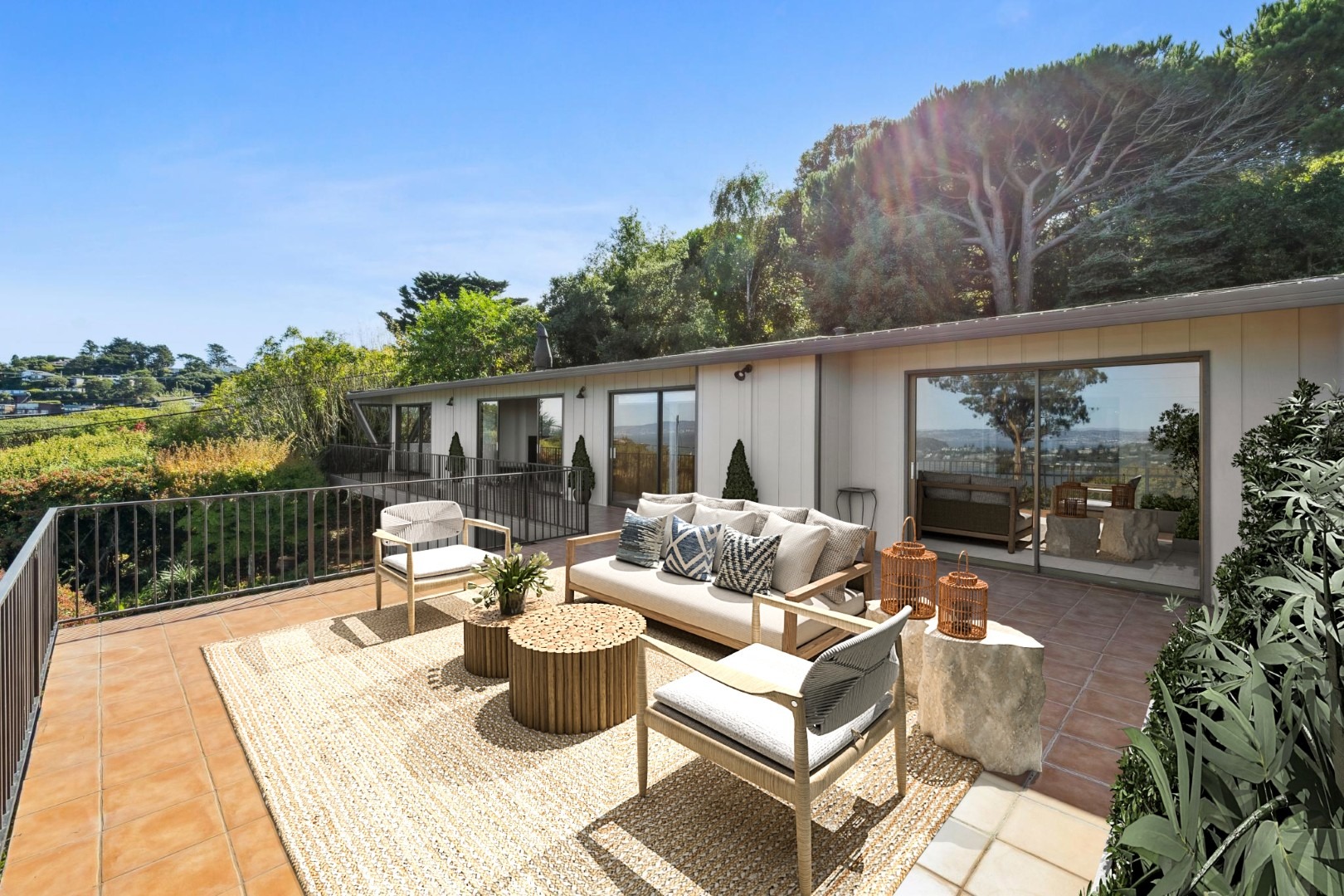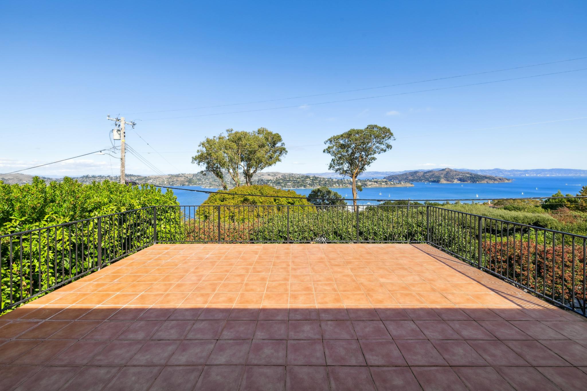 - Double sliding glass doors leading to a Spanish-tiled terrace with Bay views