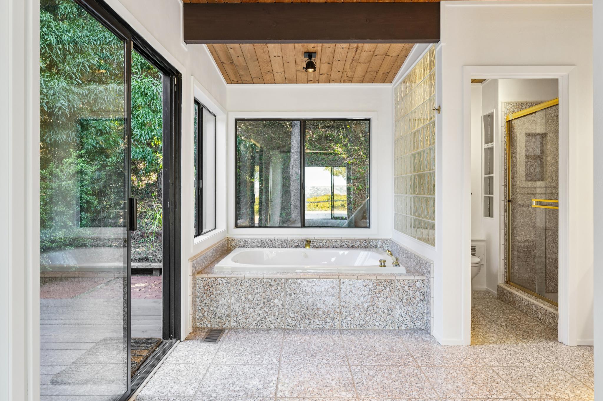 An additional bedroom on the main level, also with Bay views, open beamed ceilings, and a slider to the front terrace, echoes the home’s harmonious theme of presence and light. The guest bath, with original tiling and seashell-toned hues matching that of the primary bathroom, evokes a beachside ambiance.